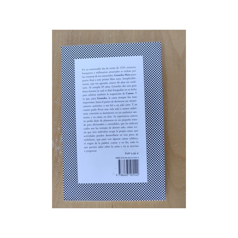 En un día memorable de otoño de 1929, mientras banqueros y millonarios arruinados se lanzaban por las ventanas de sus rascacielos, Groucho Marx puso punto final a este libro. Inexplicablemente, una vez agotado, estuvo 46 años sin reeditarse. Al cumplir 85 años, Groucho dio una gran fiesta durante la cual se dejó fotografiar en su lecho para celebrar también la reaparición de Camas. Y es que, para Groucho, la cama siempre fue muy importante, hasta el punto de declararse un «monocamero» acérrimo, o sea fiel a un solo catre. En este libro, Groucho plasma su experiencia con las camas, indicando cuáles son las ventajas de dormir solo, cómo evitar que otro individuo ocupe la propia cama, qué actividades pueden desarrollarse en esta pieza de mobiliario, qué pasó con algunas camas célebres y el origen de la palabra «cama».