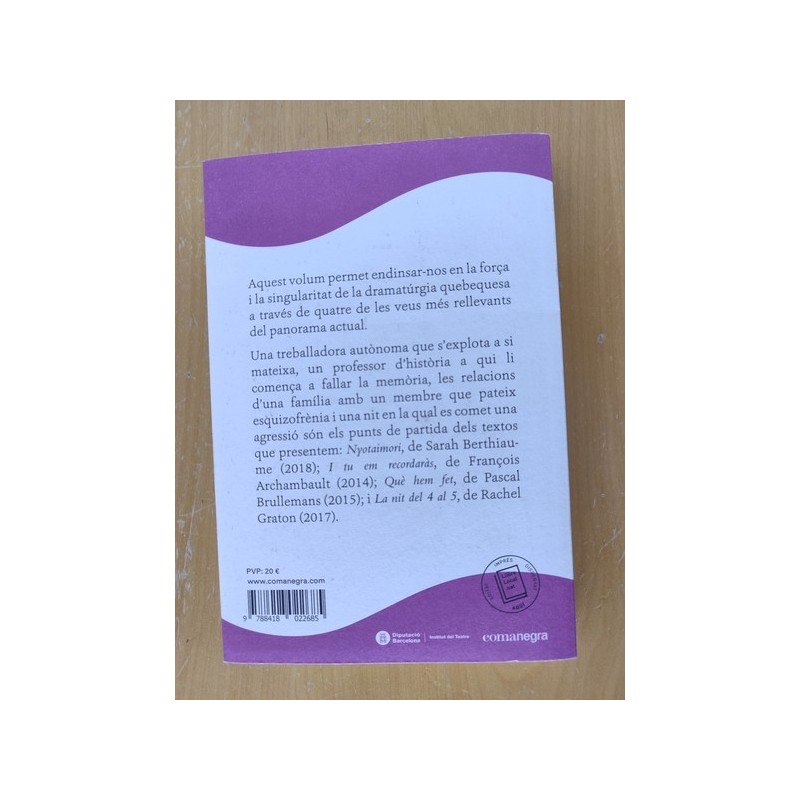 Una treballadora autònoma que s’explota a si mateixa, un professor d’història a qui li comença a fallar la memòria, les relacions d’una família amb un membre que pateix esquizofrènia i una nit en la qual es comet una agressió són els punts de partida dels textos que presentem: 'Nyotaimori', de Sarah Berthiaume (2018) . 'I tu em recordaràs', de François Archambault (2014) . 'Què hem fet', de Pascal Brullemans (2015) . i 'La nit del 4 al 5', de Rachel Graton (2017).
